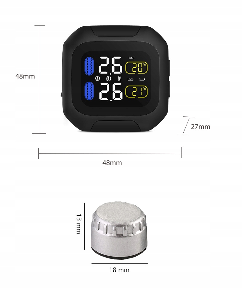 Każdy z bezprzewodowych czujników ciśnienia wyposażony jest w baterię CR1225, bateria może działać nawet do 8 miesięcy. Po wyczerpaniu należy dokonać wymiany baterii na własny koszt. W zestawie znajduje się również nakrętka, która pozwala na otwarcie czujnika i wymianę baterii.